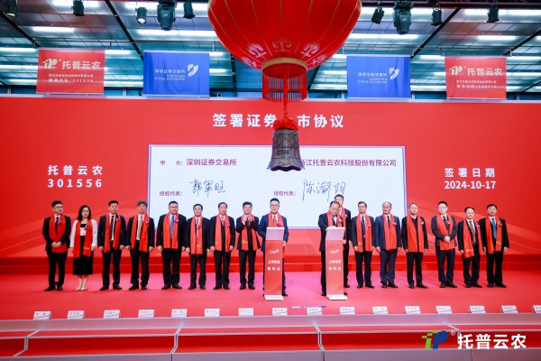 2024年10月17日,隨著深圳證券交易所儀式大廳的鐘聲響起,浙江托普云農(nóng)科技股份有限公司(股票簡(jiǎn)稱(chēng):托普云農(nóng),股票代碼:301556)正式在深交所創(chuàng)業(yè)板鳴鐘上市!